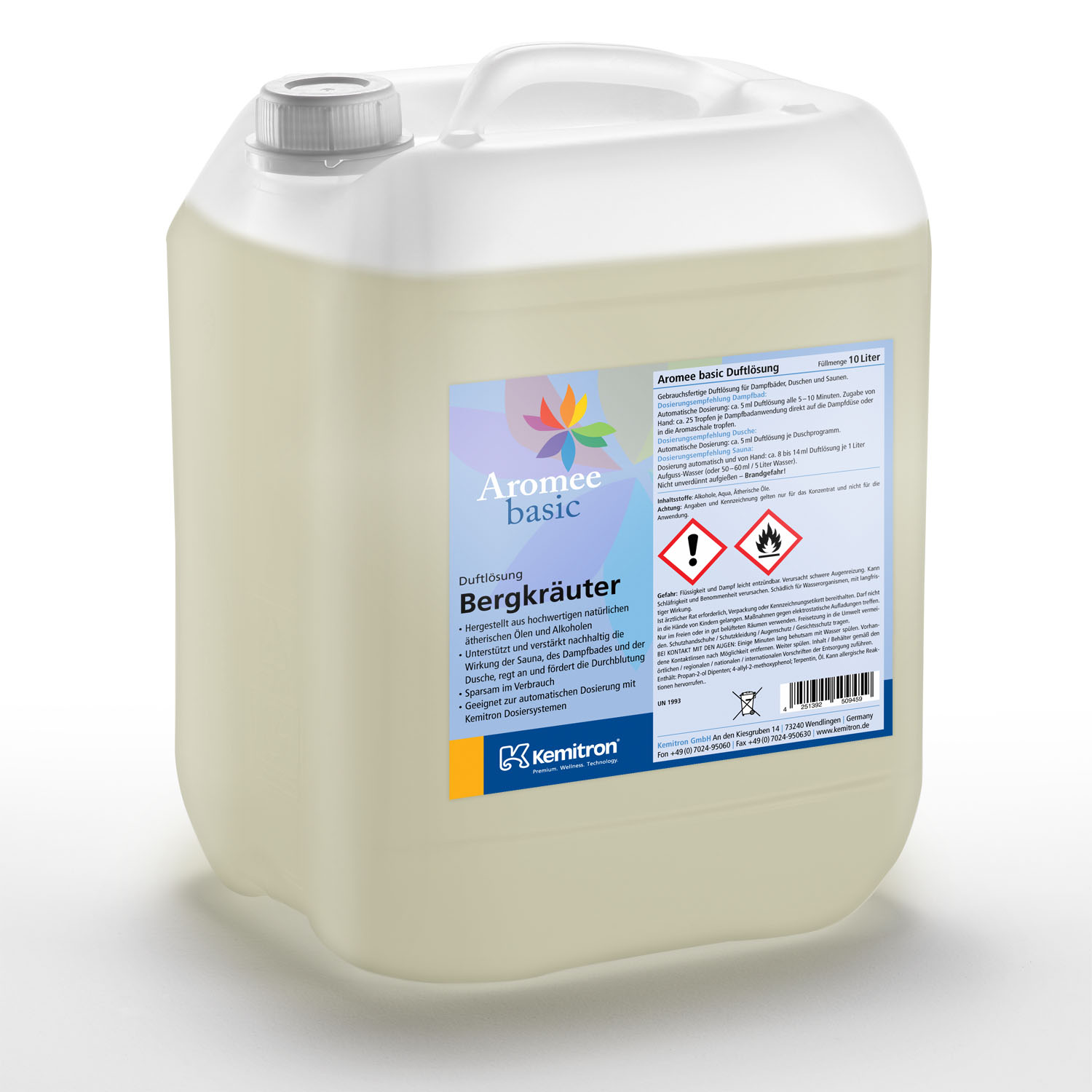 Gebrauchsfertige Duftlösung "Bergkräuter" in hoher Qualität für Dampfbäder, Duschen und Saunen. Guter Dufteffekt bei höherem Verbrauch – für kostenbewusste Großverbraucher mit Qualitätsanspruch.