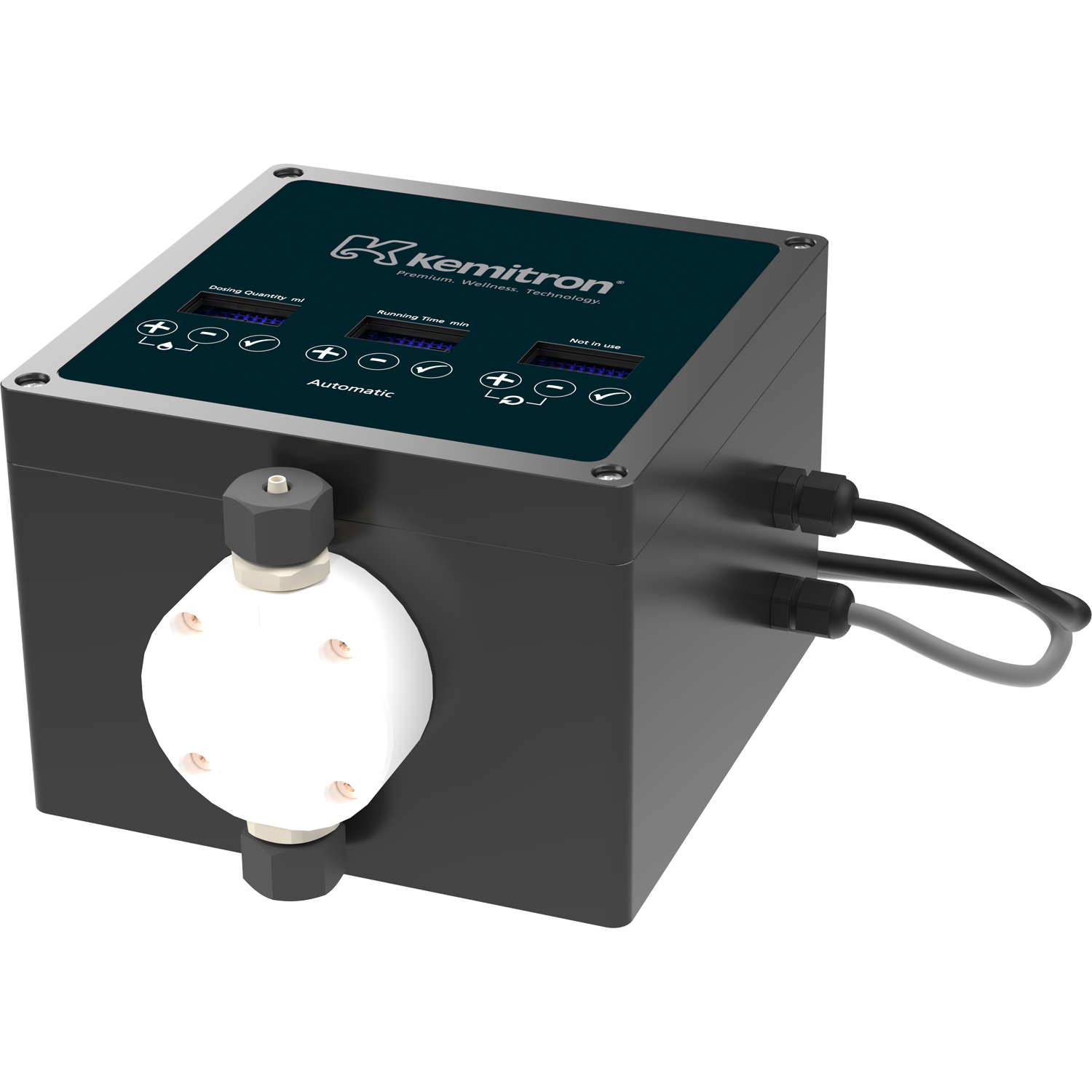 Die Technico Dosierpumpe kommt in einem geschlossenen, spritzwasserfesten Kunststoffgehäuse. Der Antrieb erfolgt über einen Exzenter-Getriebemotor.